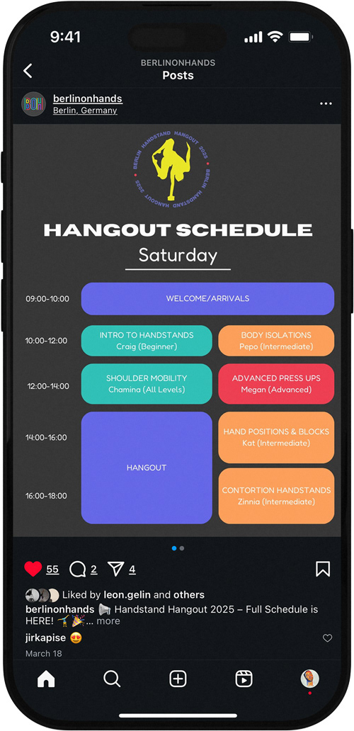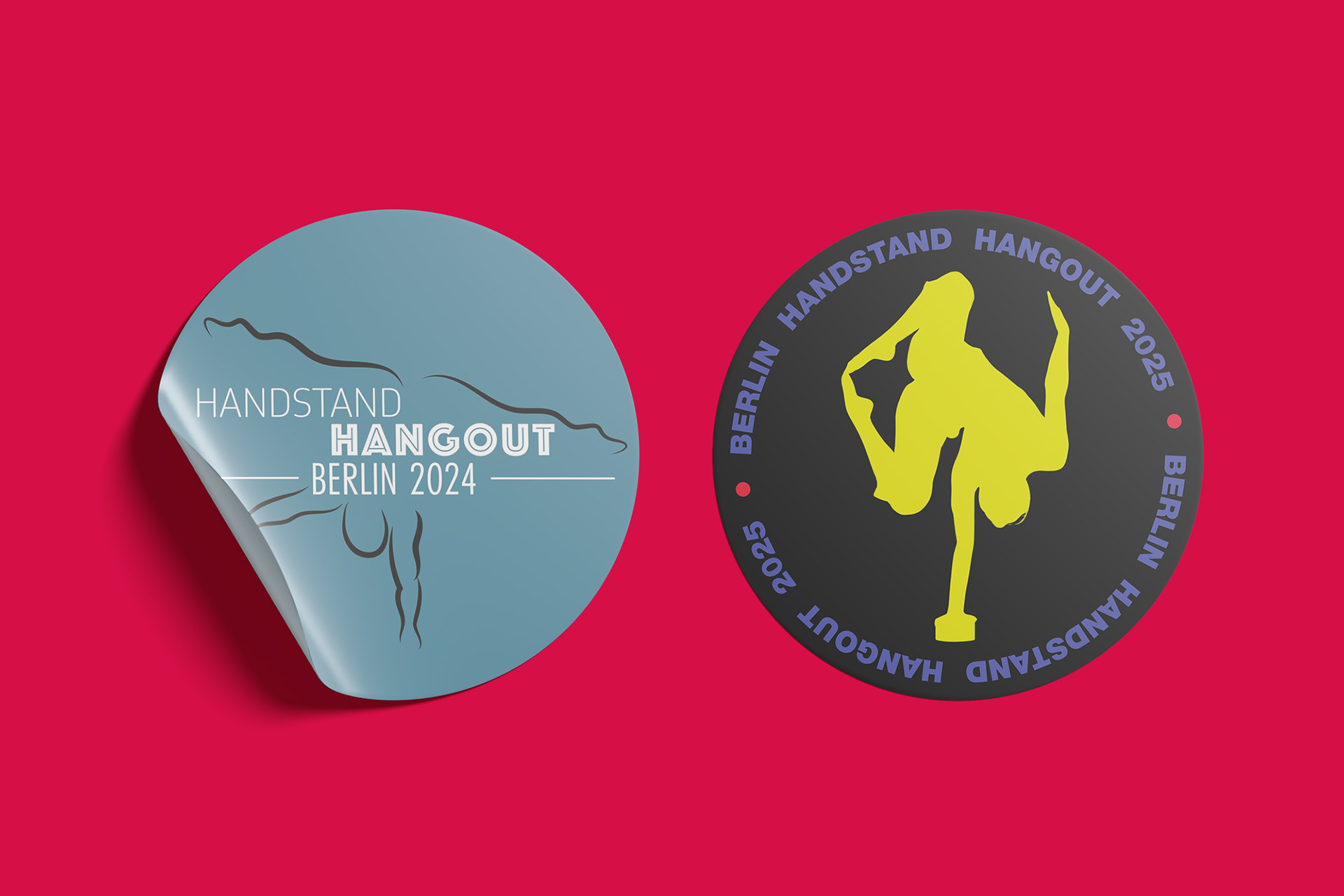 I designed stickers for Berlin’s last two annual Handstand Hangouts, a convention for hand balancers. My design was also used in the events timetable pictures below.